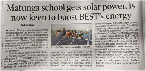 Recently, we (SOL POWER) has completed 100 kWp Solar Photovoltaic Roof Top Grid Connected Power Plant at Amulakh Amichand School, Gujarati Kelavani Mandal, Matunga, Mumbai. The Set-up of Plant is in line with GO GREEN 100% and IMPROVE THE CARBON FOOTPRINT using alternate non-polluting renewal source of Solar Energy by the School. The entire system is Governed under “Net Metering Policy” by B.E.S.T. / MEDA / MNRE. The excess Surplus Power Generated on Weekly Offs, Holidays & Vacations will be Fed back to B.E.S.T grid. By going GO GREEN, System is Reducing 127.75 Tons of Carbon Emission and helping for Better Environment.